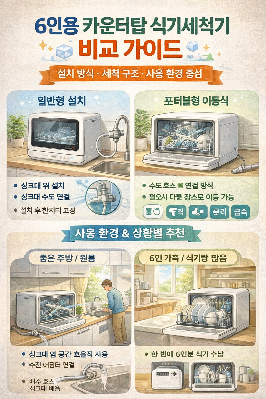 이 글에서는 국내에서 많이 선택되는 6인용 카운터탑 식기세척기 두 유형을 기준으로,