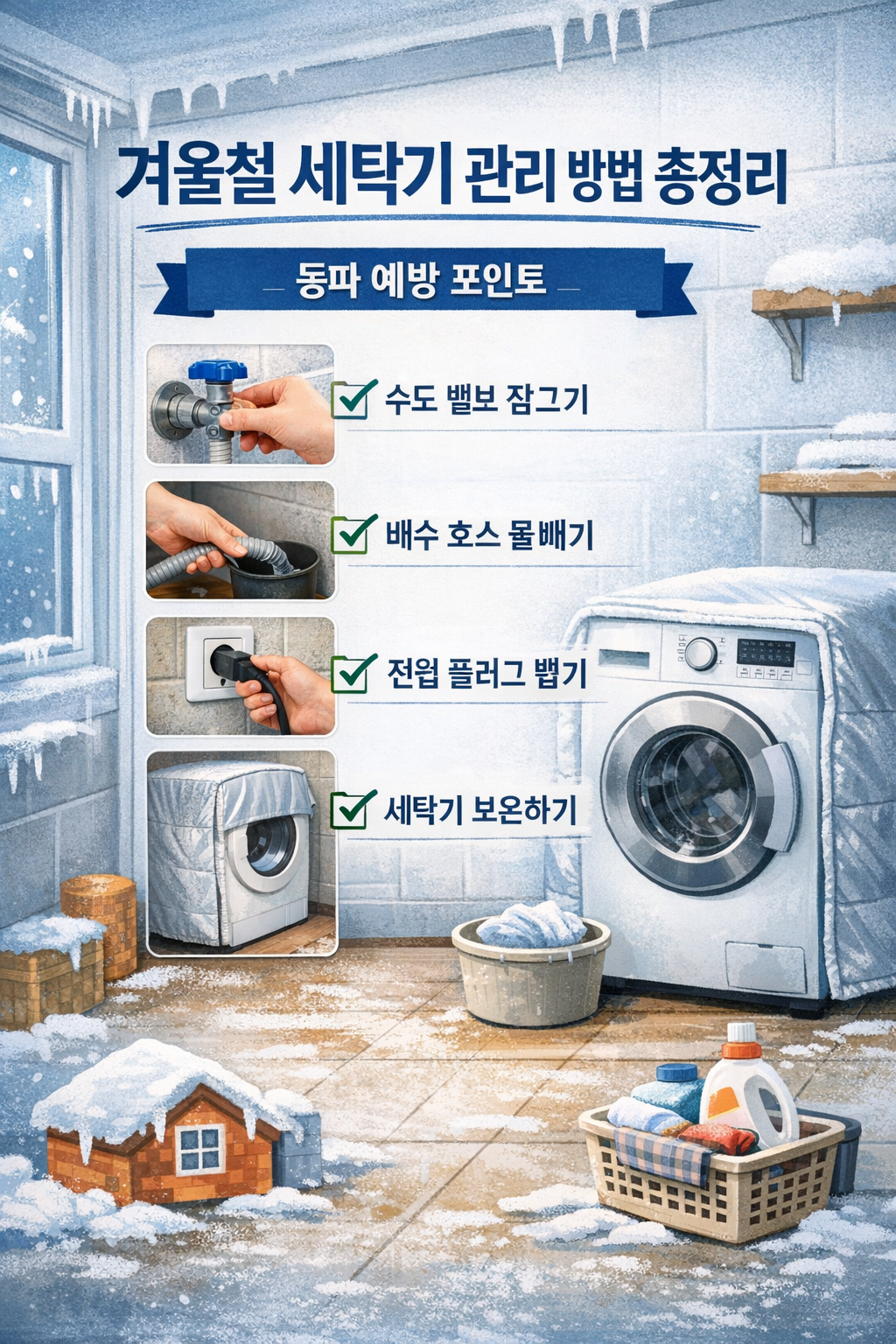 이 체크리스트만 꾸준히 실천해도 겨울철 세탁기 고장의 대부분을 예방할 수 있습니다.